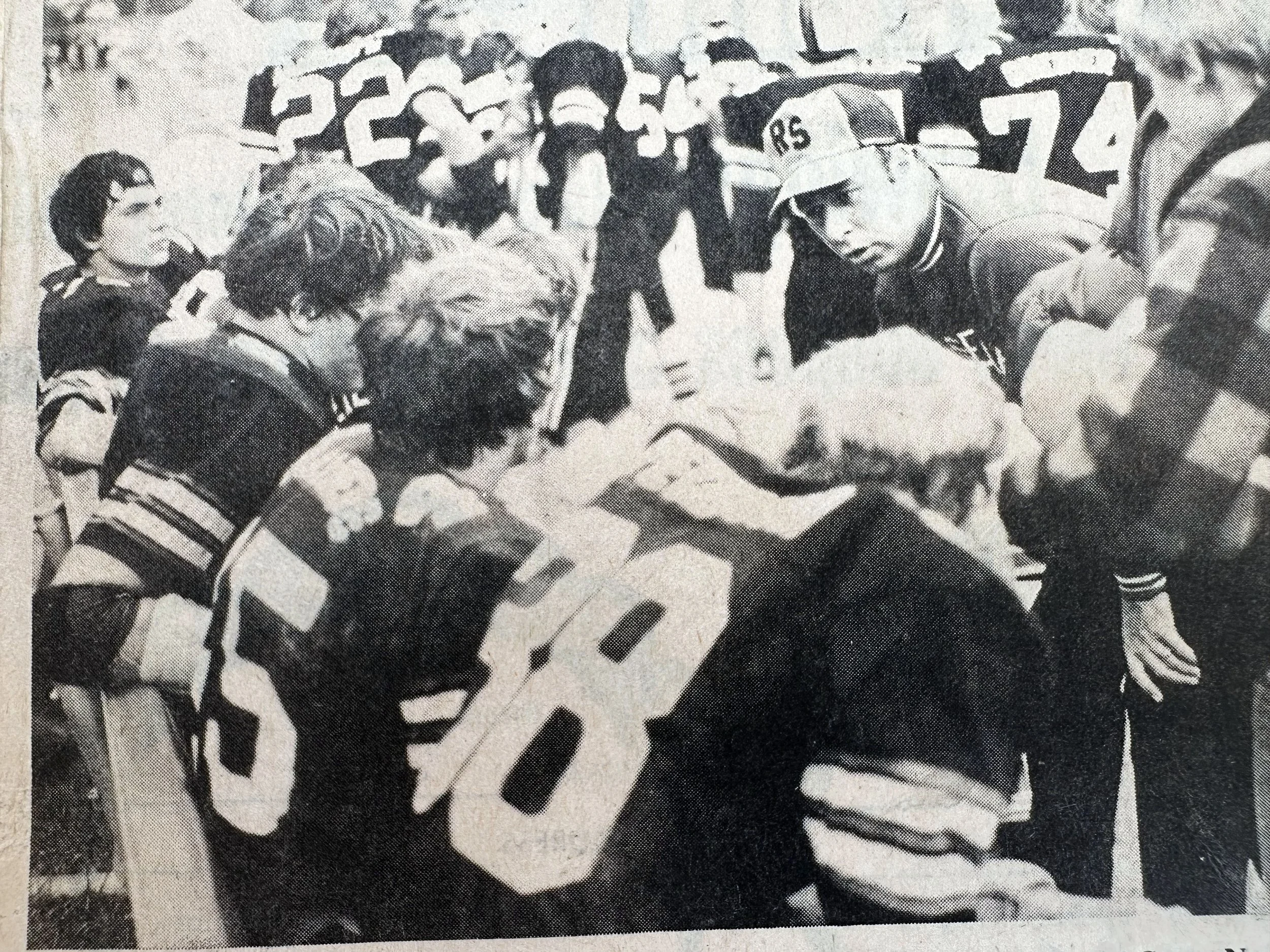Photo by Ron Chelsvig, Fall 1979 or 1980. R-S football coaches.